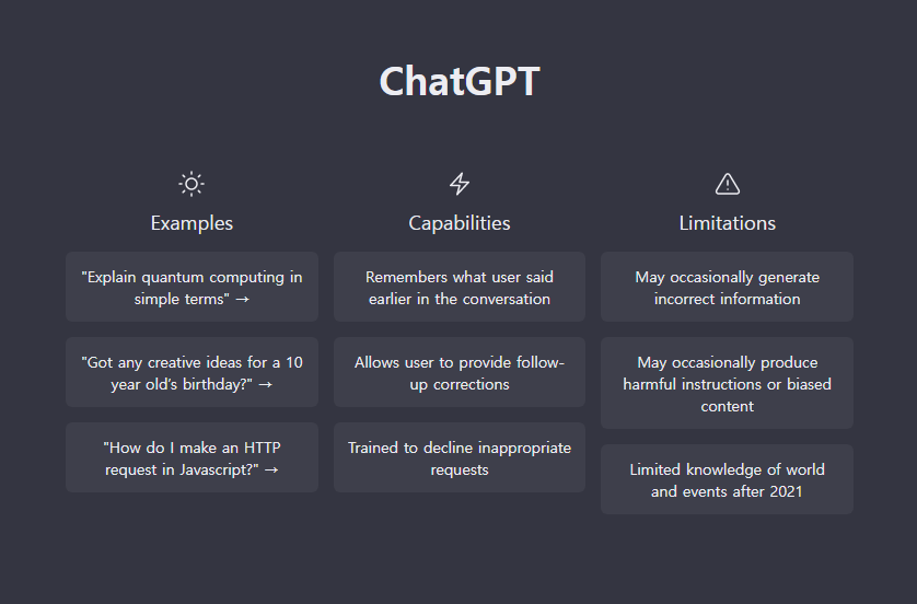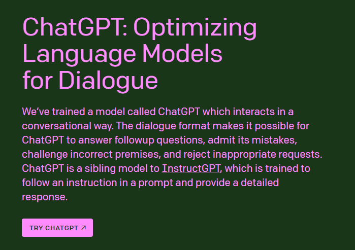 We’ve trained a model called ChatGPT which interacts in a conversational way. The dialogue format makes it possible for ChatGPT to answer followup questions, admit its mistakes, challenge incorrect premises, and reject inappropriate requests. ChatGPT is