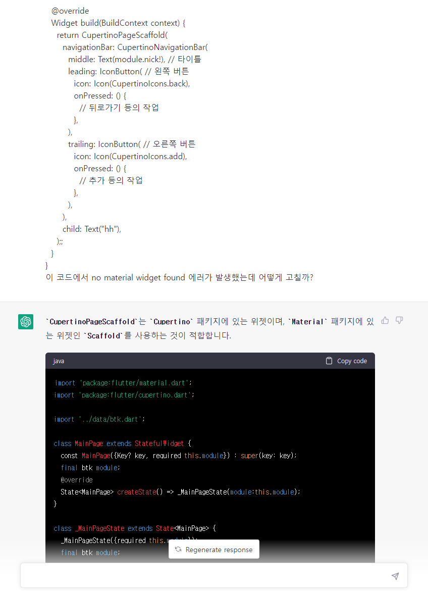 기초적인 내용일지 모르겠으나, 내 경우 cupertino 스타일의 앱을 만들고 싶은 마음에 material에 해당되는 위젯들을 전부 cupertino로 바꾼 상황이었다. 요점을 정확하게 파악해서 코드를 수정까지 해준다.