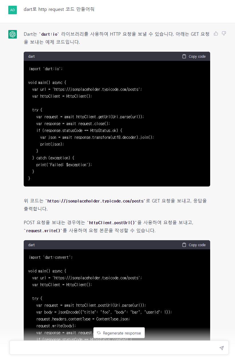 우선, 최근에 Flutter 프레임워크에 흥미가 생겨 dart 언어를 공부하는 중인데, 맨땅에 해딩하다보니 검색해도 잘 안나오는 경우가 많다. 이때 ChatGPT를 이용해 질문을 해봤다.